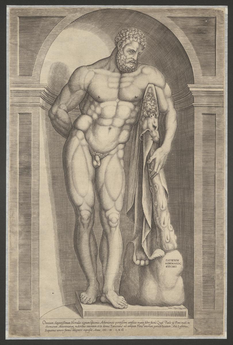 Omnium elegantissimum Herculis signum Gliconis Atheniensis peritissimi artificis manu fabrefactum, quod Paulo III Pont. Max. in thermarum Antoniniarum ruderibus inventum, et in domus Farnesianae ad campum Florae interiori porticu locatum Från series: Speculum Romanae Magnificentiae