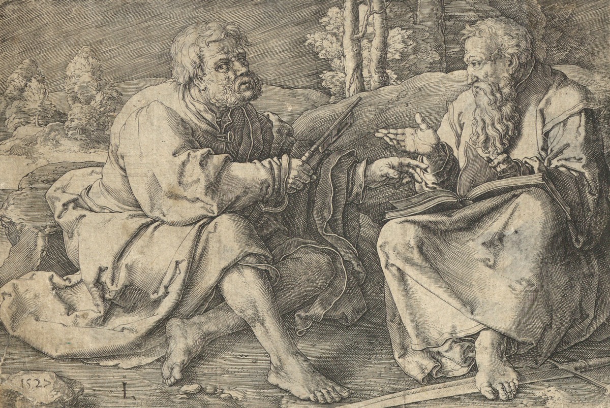 Helgonen Petrus och Paulus sittandes i ett landskap