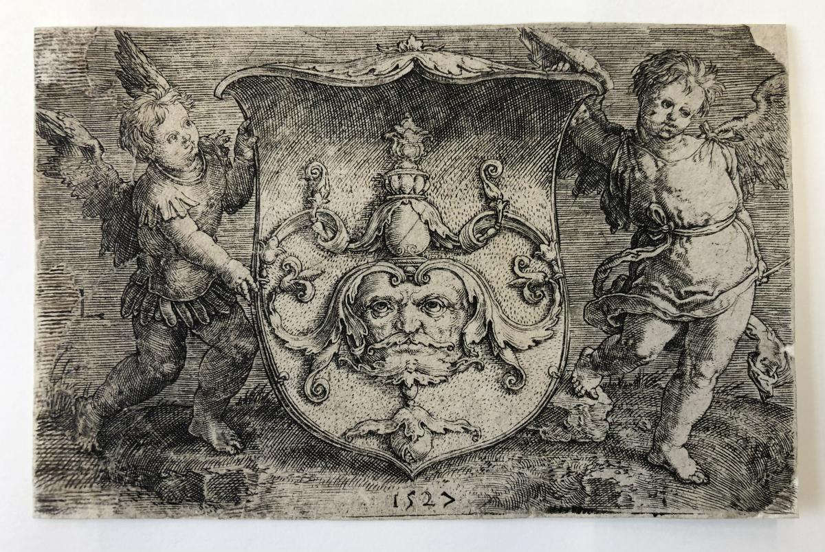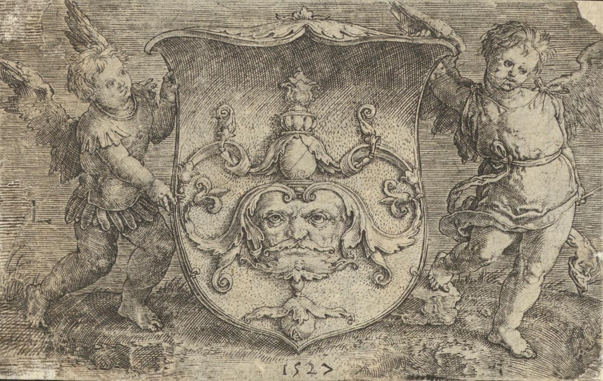 Coat of Arms with a Mask, Held by Two Genii