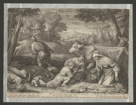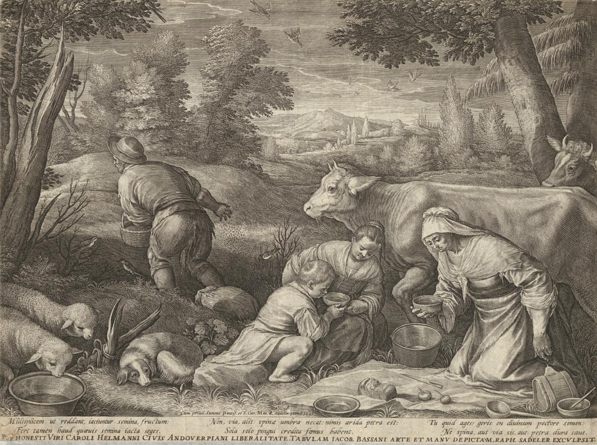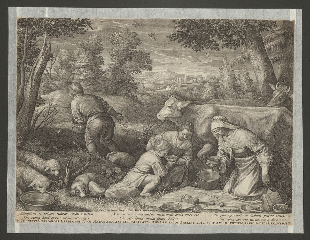 Påskrift (I mitten i plåten): Multiplicem ut reddant ... / ... petra dura ca[...]" and "Honesti Viri Caroli Helmanni Civis Andoverpiani Liberalitate tabvlam Iacob. Bassani arte et manv depictam, Raph. Sadeler excvdit