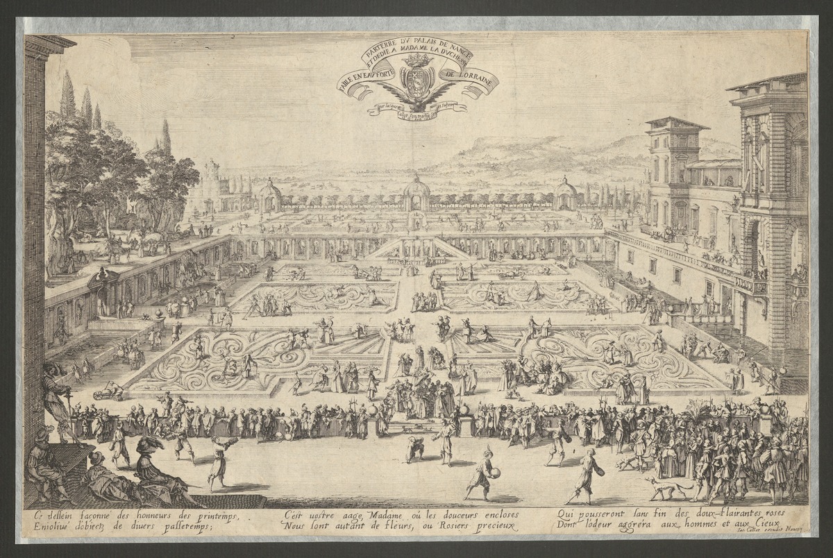 Påskrift (ned i mitten i plåten): TAILLE EN EAV FORTE / PARTERRE DV PALAIS DE NANCY / ET DEDIE A MADAME LA DVCHESSE / DE LORRAINE