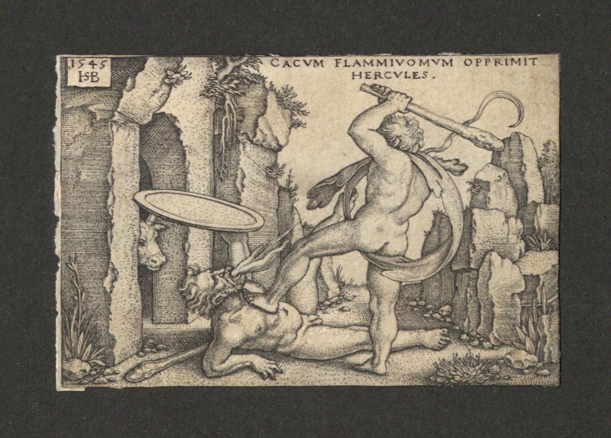 Påskrift (I mitten i plåten): Cacum Flammivomum Opprimit Hercules