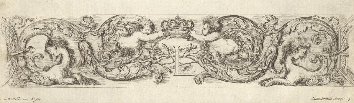 Design for a Frieze with Two Putti holding a crown over the letter 'L' (for Louis XIV?), plate 3 from "Decorative friezes and foliage" (Ornamenti di fregi e fogliami)
