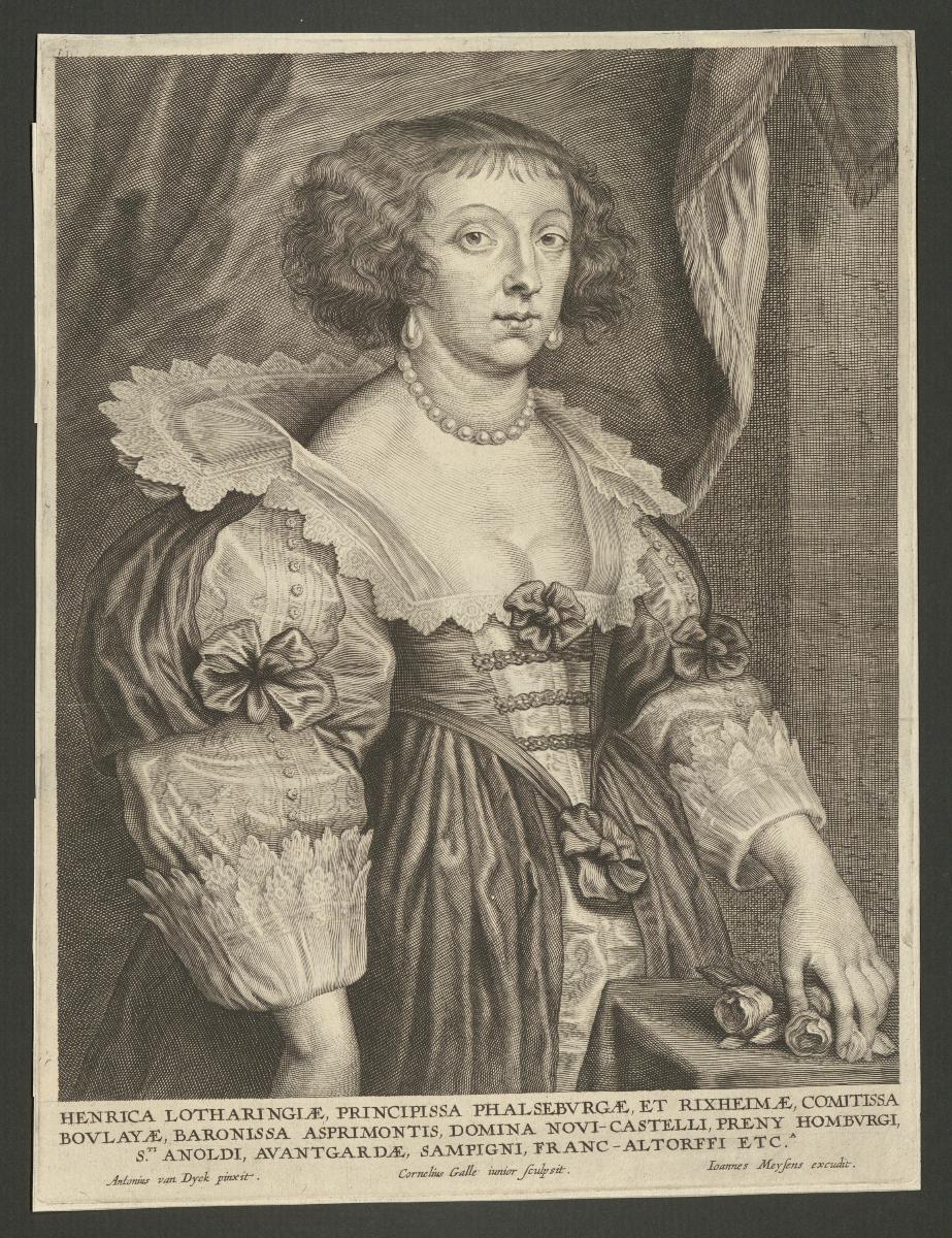 Påskrift neder i mitten: HENRICA LOTHARINGIAE, PRINCIPISSA PHALSEBURGAE, ET RIXEIMAE, COMITISSA BOULAYAE, BARONISSA ASPRIMONTIS, DOMINA NOVI-CASTELLI, PRENY HOMBURGI, S.TI ANOLDI, AVANTGARDAE, SAMOIGNI, FRANC-ALTORFFI ETC.A