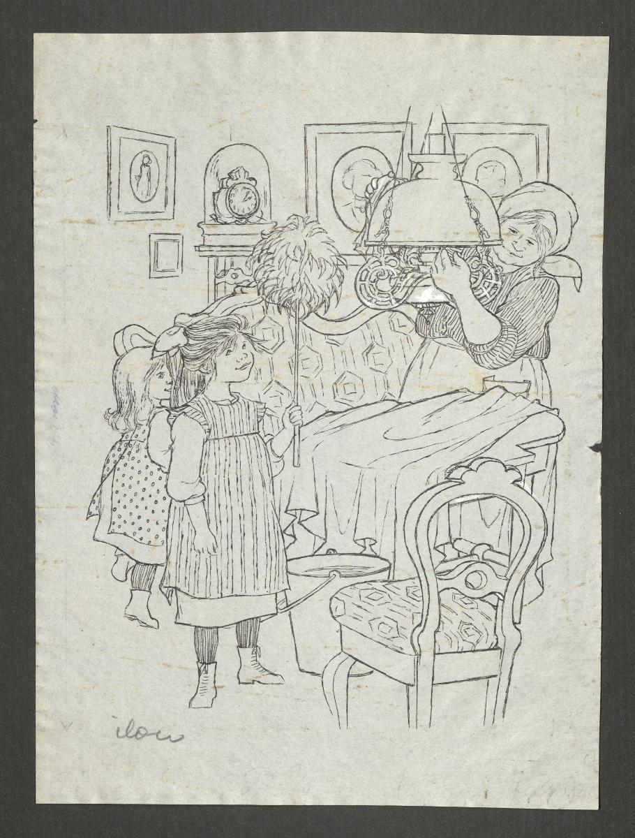 Madicken och Lisabet kliver runt bland skurhinkarna (ur Madicken)