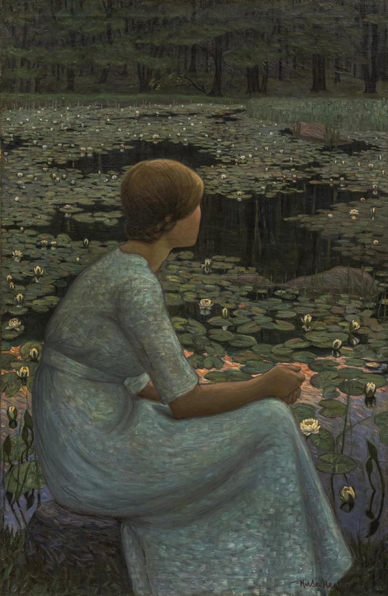 En enorm sjö, översållad av vita näckrosor, brer ut sig framför oss. Skymningen har lagt sig över landskapet. Längst bort i skogsmynningen reser vassen tätt upp sig ur vattnet. På land tar en skog vid, full av täta lövträd med mörka stammar. Vi är inte ensamma om att beskåda denna vackra plats. På en sten i förgrunden sitter en gestalt iklädd en ljusblå klänning. Framför henne avspeglar sig en röd himmel i vattenytan. Gestalten vilar händerna i knät. Håret är uppsatt i flätor som möts i nacken. Med en avslappnad hållning söker sig hennes blick långt bort i fjärran. Vilka tankar rör sig i hennes huvud?