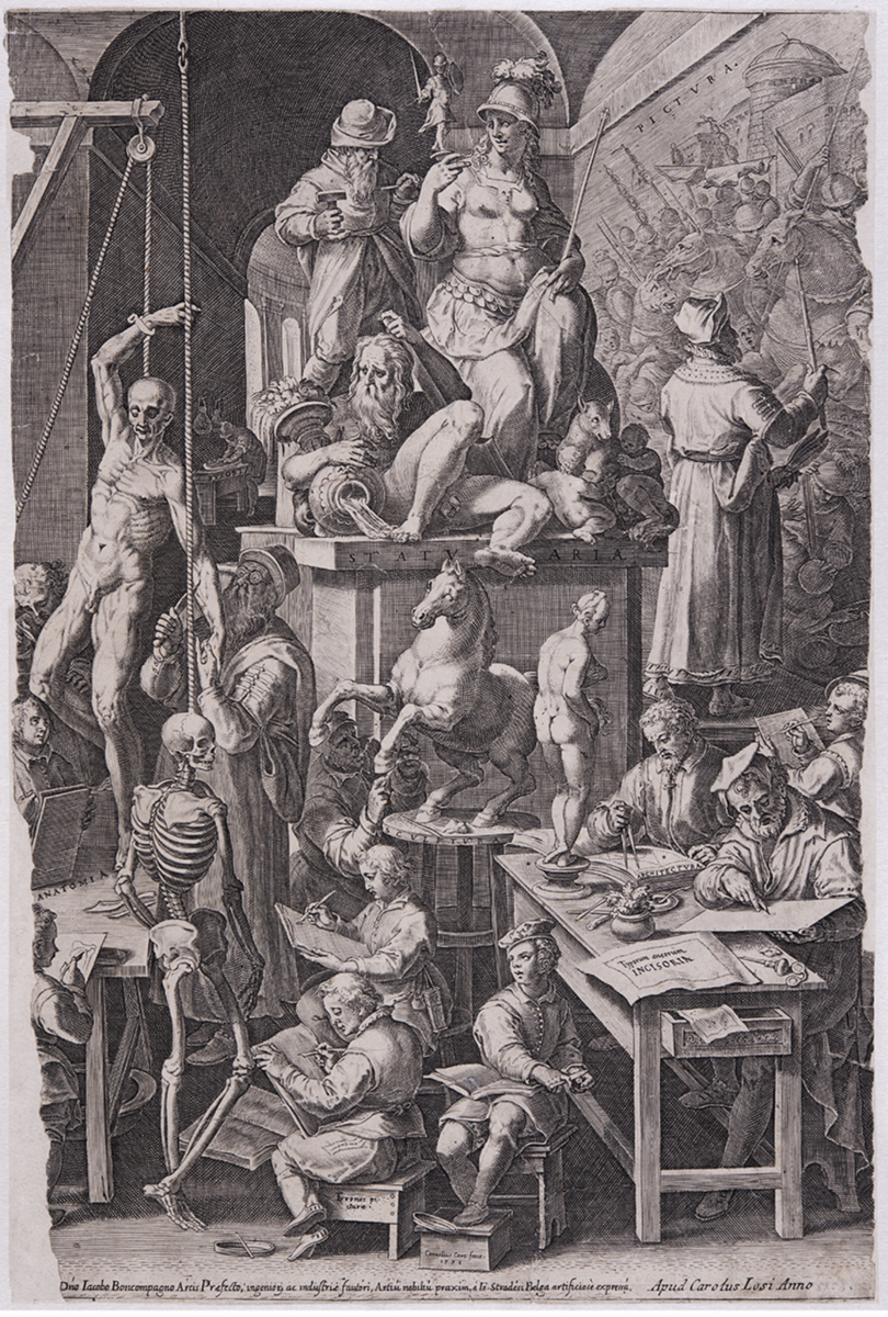Utöver den vetenskapliga aspekten blev anatomin så småningom en viktig del av de konststuderandes utbildning. Mot slutet av 1500-talet erbjöd konstakademierna i Florens, Bologna och Rom möjligheten för sina studenter att under vintermånaderna studera anatomi genom dissekering, vilket det här verket ”De sköna konsternas Akademi” är ett exempel på.