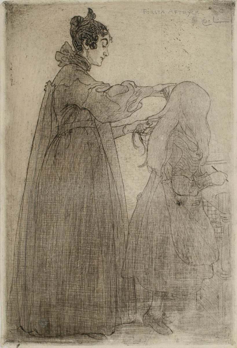 1904 gjorde konstnären en blyertsteckning med Karin och Kersti, som var direkt avsedd att omsättas i en etsning. Den visar Karin, som kammar yngsta dottern, som i sin tur skriver i sista minuten på sin läxa innan hon ger sig av till skolan.