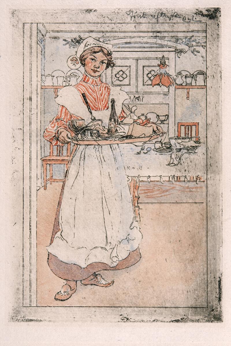 Etsningen Martina med frukostbrickan från 1904 går tillbaka på en oljemålning, som Carl Larsson utförde samma år och som inköptes av museet för modern konst i Venedig. Motivet är från Sundborn. I dörröppningen står tjänsteflickan Martina med den tungt lastade frukostbrickan, och bakom henne skymtar matsalen med dalastolar, hyllor med tennstop och tallrikar och i taket en elektrisk lampa i art nouveau. Det avbildade b Bladet är ett provtryck, som konstnären laverat med lätt hand i rött och blått. Tillägget var avsett att ange den effekt han ville uppnå med färgetsningen; den senare trycktes endast på prov i ett fåtal exemplar. Även detta handkolorerade blad hör till konstnärens gåva till museet 1907. I samlingarna ingår också den version utan färg, som Föreningen för Grafisk Konst gav ut 1904 i stor upplaga.