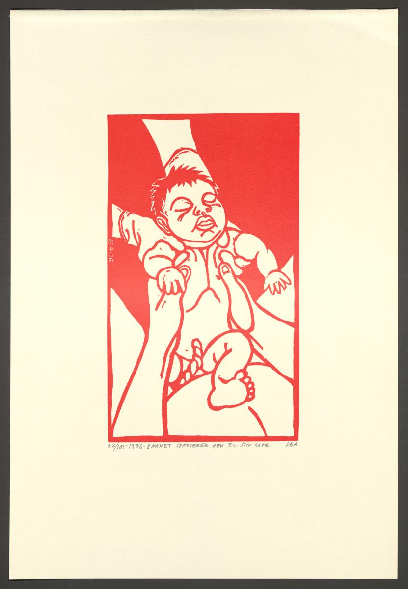 Bilden är ett grafiskt tryck gjort i linoleumsnitt. Den skarpa kontrasten mellan rött och vitt kan signalera kärlek och värme såväl som fara och kamp. Känslor som alla kan vara närvarande inför ett nytt föräldraskap och en stundande barndom. De handskklädda händerna signalerar ett överlämnande, in i en ny gemenskap, byggd på både trygghet och utsatthet.