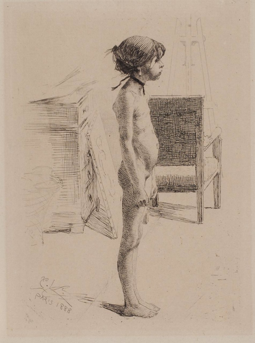 I sin självbiografi Jag har konstnären berättat att de tillgängliga modellerna ofta var italienare. En dag knackade en mager liten flicka på dörren och undrade om han hade behov av modell. Med lätt hand tecknade konstnären henne i blyerts i sin ateljé.