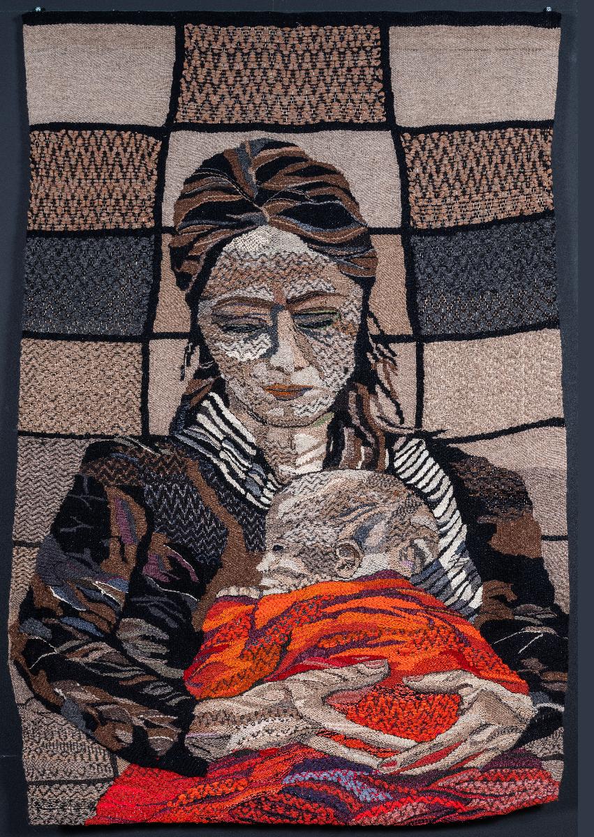 Ett rutmönster utgör bakgrunden i #veckansverk. Rutorna är avgränsade med svarta konturer och går i mörkblått och olika nyanser av beige. I förgrunden finns en kvinna med ett spädbarn i famnen. Hon bär en mönstrad kofta i samma färgskala som bakgrunden. Det långa håret är halvt uppsatt och mörkt med ljusbruna slingor. Hon tittar ner mot barnet, som lutar hela sin kropp mot hennes bröst och vilar med huvudet åt sidan. I profil avtecknas det lilla ansiktet, vi ser ett öga, ett öra, och en hand som sticker upp precis intill munnen. Ett rött plagg, eller en filt, omsluter kroppen. Färgen står i skarp kontrast mot den dova omgivningen.
