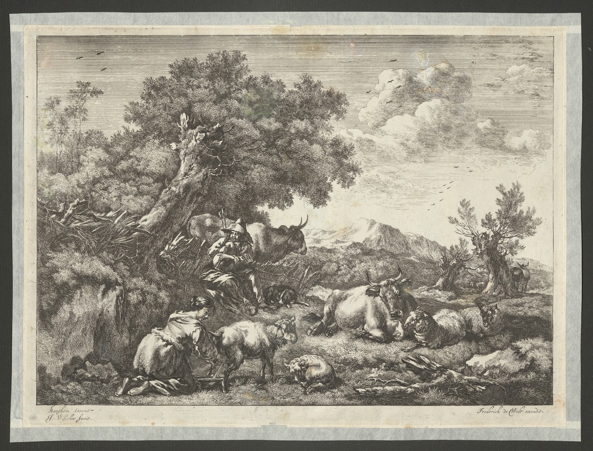 Herdsman Playing the Bagpipe and Women Milking Goats