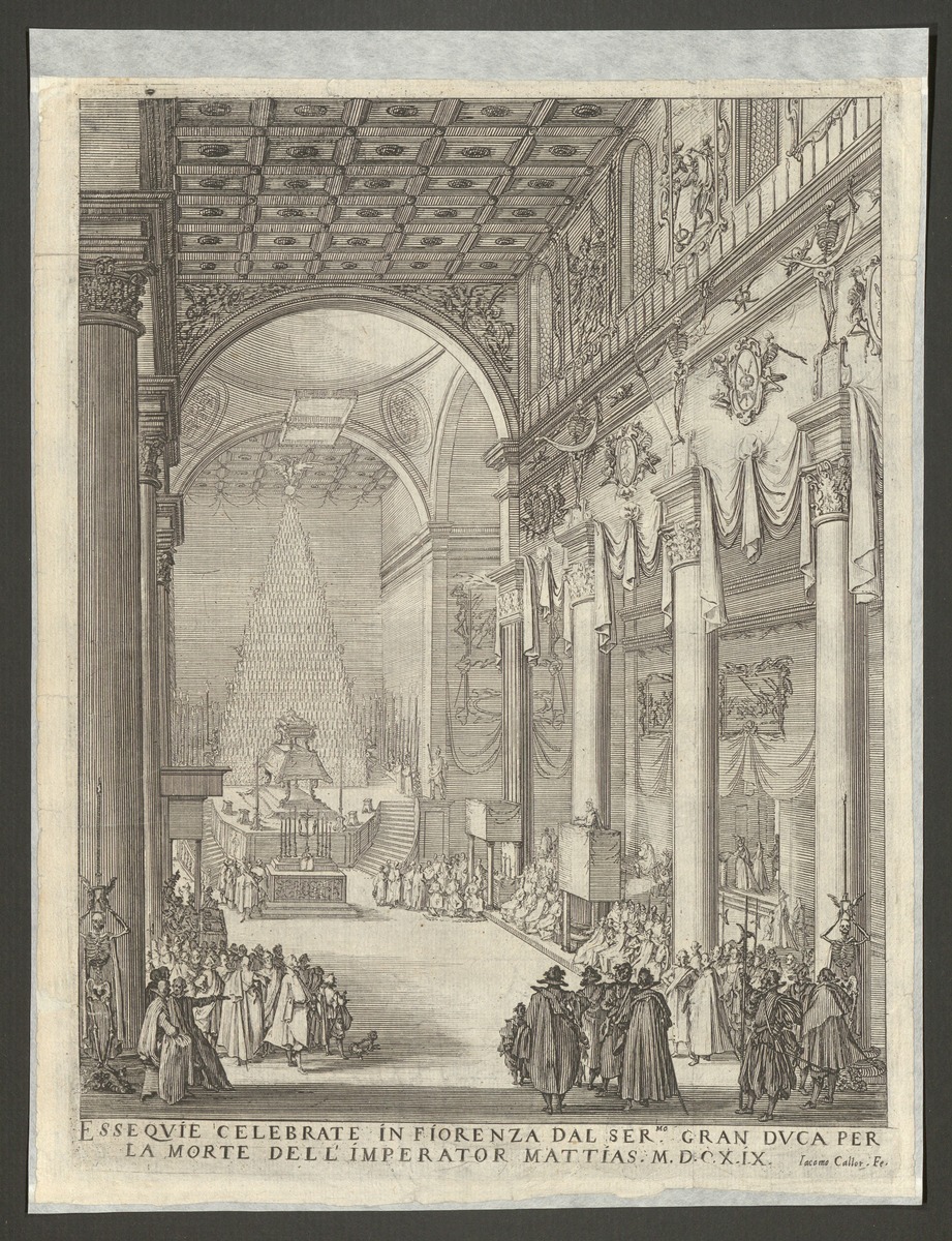 Påskrift (nedtill i plåten): ESSEQVIE CELEBRATE IN FIORENZA DAL SERmo GRAN DVCA PER / LA MORTE DELL'IMPERATOR MATTIAS. M.D.C.X.I.X.