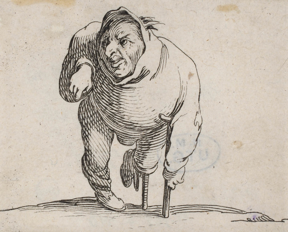 De puckelryggade - Krympling med en krycka och ett träben