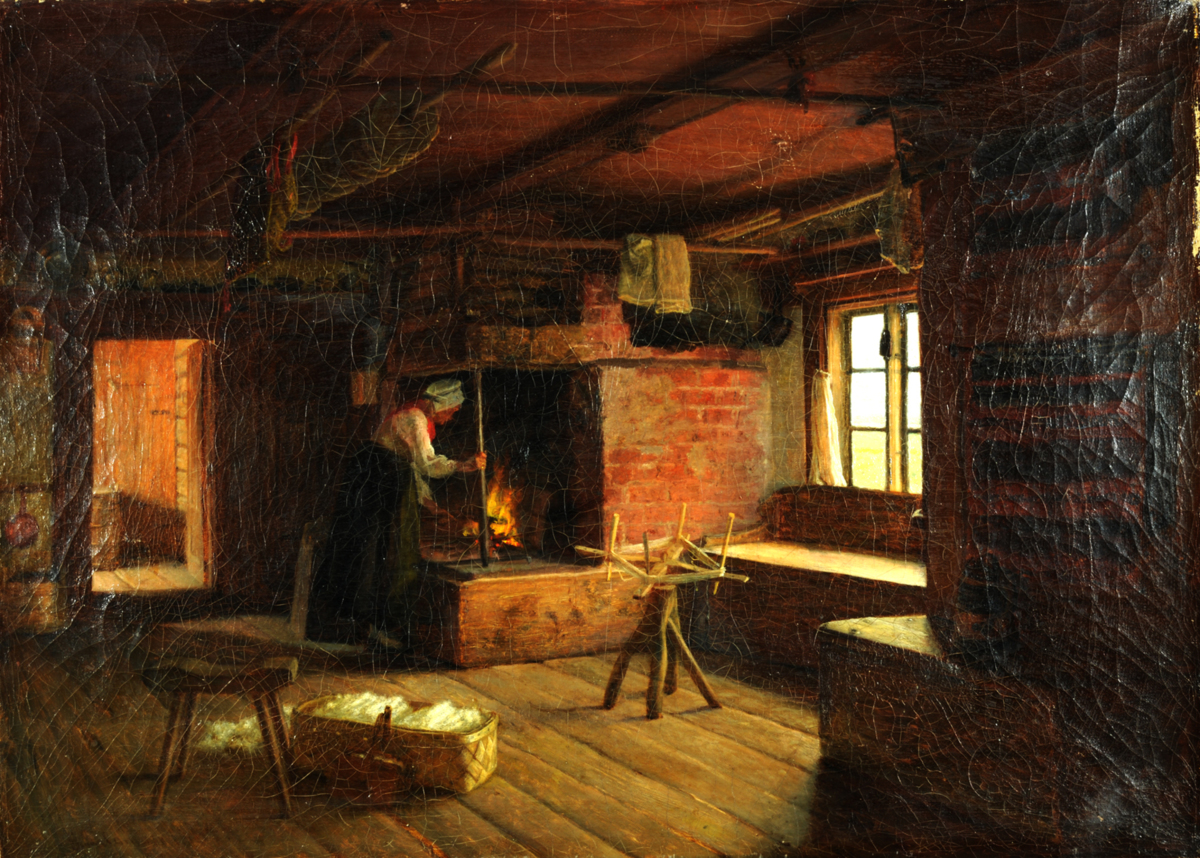 En bondmora iklädd röd väst, vit blus och en mörk kjol gör upp eld i spisen. Ljuset silas in genom fönstret till höger och från dörren till vänster. Kläder hänger på tork. Knäckebröd är uppträtt på en stång i taket. På väggen till höger hänger några vävda textilier och på kistan under dem står ett träkrus. Längs väggar och tak hänger kopparkittlar och andra köksföremål. Vid dörren finns en tunna och en skopa. Allt påminner om arbete och vardag i det lantliga hemmet. Den flätade korgen med ull som står mitt på golvet, skvallrar om att kvinnan har avbrutit sitt arbete med att först karda och sedan spinna ullen till tråd, för att tända brasan.