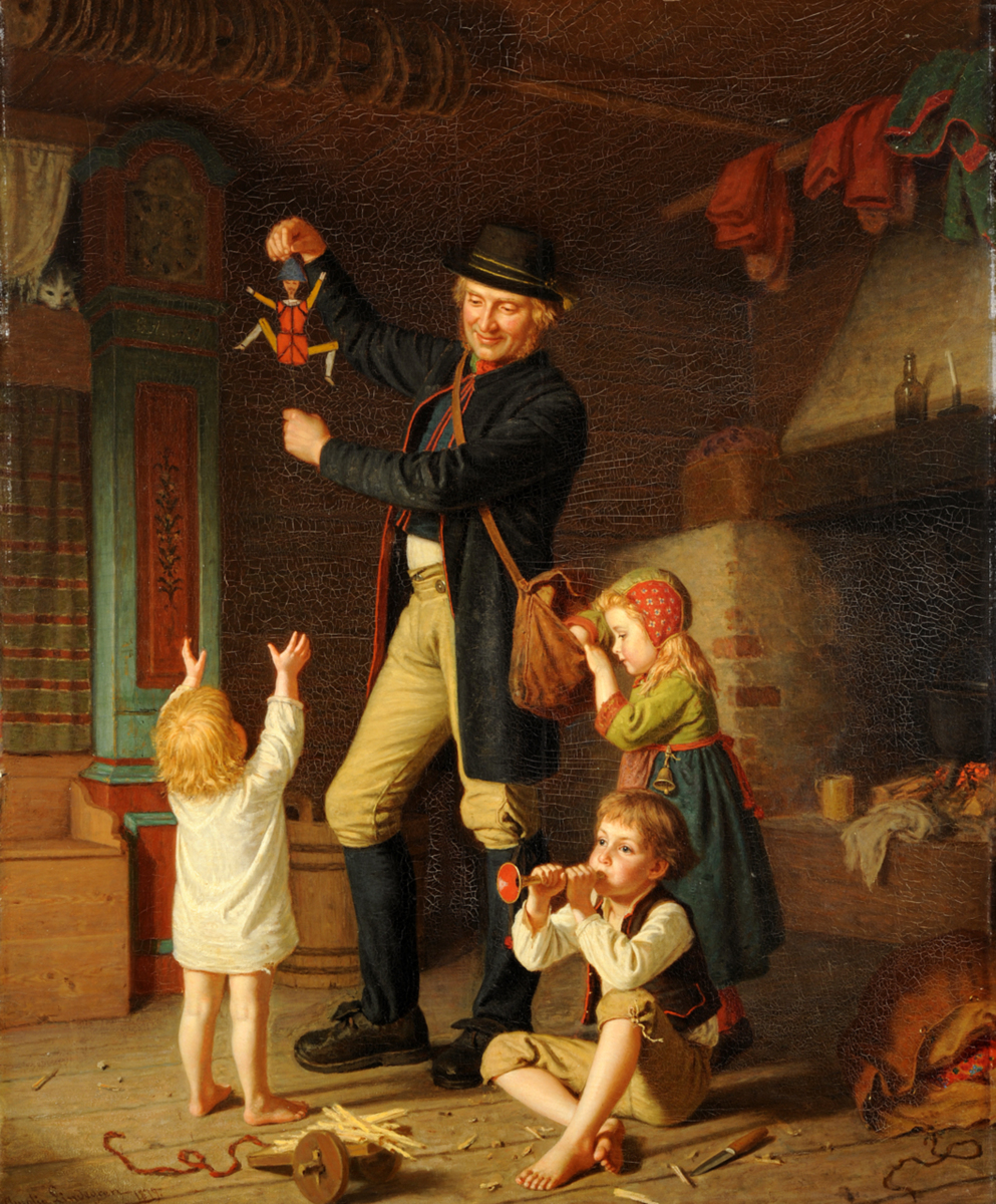 Motivet föreställer en man omgiven av tre barn som tilldelas leksaker och presenter. Ett av barnen letar i mannens väska för att se efter om det kan finnas fler. Kanske har mannen varit på en resa och köpt med sig saker till barnen. Gemytliga motiv som detta gjorde Amalia Lindegren till en mycket folkkär konstnär under sin levnadstid, samt för eftervärlden.