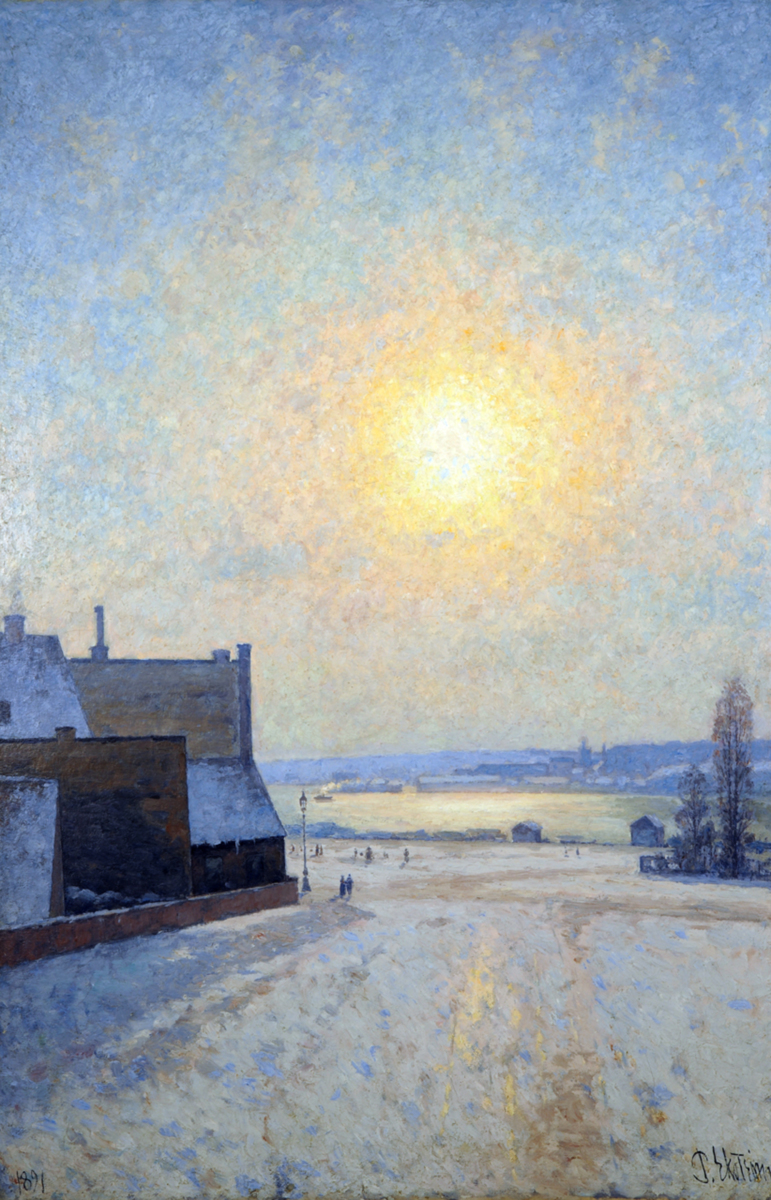 Att Per Ekström är motljusets främste skildrare i svensk konst blir man varse inför denna målning. Scenen är ett landskap från vad som på den tiden var Stockholms utkanter men idag tillhör centrum, nämligen Nybroviken där konstnären hade sin ateljé. Vyn har karaktär av ett lyriskt vinterlandskap men några kantiga huskroppar i bildens vänsterkant, med murar, tak och skorstenar, bryter idyllen och påminner om civilisationen. Nere vid kajkanten finns några skjul. En ångbåt rör sig över vattnet och på andra sidan viken skymtar andra huskroppar och snötäckta tak. Invid en gatlykta i förgrunden rör sig två gestalter och längre in i bilden, på den tomma planen ner mot kajen, syns stadsinvånare på söndagspromenad eller på väg till sina arbeten. Till höger står två nakna träd omgärdade av staket. Bilden går i ljusa toner, från solens gulvita sken till himlens gråaktiga ton och de ljusblå skuggorna.