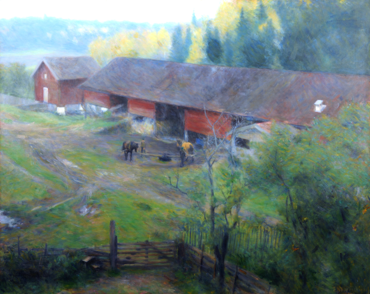 Erik Werenskiold var den ledande norske landskapsmålaren under 1880-talet. Han tog intryck av naturalismen och det franska friluftsmåleriet under studier i Paris. Efter återkomsten till Norge 1883 fick hans måleri en mer nationalromantisk prägel. Han målade bönderna och landskapet i Telemark. Motivet från bondgården är vardagligt men har samtidigt en atmosfär och stämning som skiljer det från den mer prosaiska naturalismens hårda och avslöjande ljus.