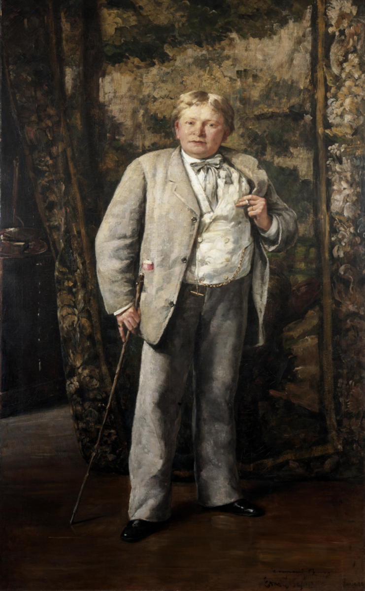 Landskapsmålaren Carl Skånberg står rakt upp och ned i ljusgrå kostym, vit väst och kravatt. Han sträcker ut ena benet i en elegant rörelse och håller sitt så kallade spanskrör (en typ av promenadkäpp) i högerhanden med det ringprydda lillfingret utsträckt. Vänsterhandens tumme är placerad innanför västen. Mellan pek- och långfingret håller han en cigarett och det rosa cigarettpaketet sticker upp ur kavajfickan. Guldkedjan i västen glimmar och de svarta lackskorna är blankputsade. Med självmedveten hållning lutar Skånberg huvudet något på sned och ser mot betraktaren med rak blick. Det blonda håret är kammat till mittbena.