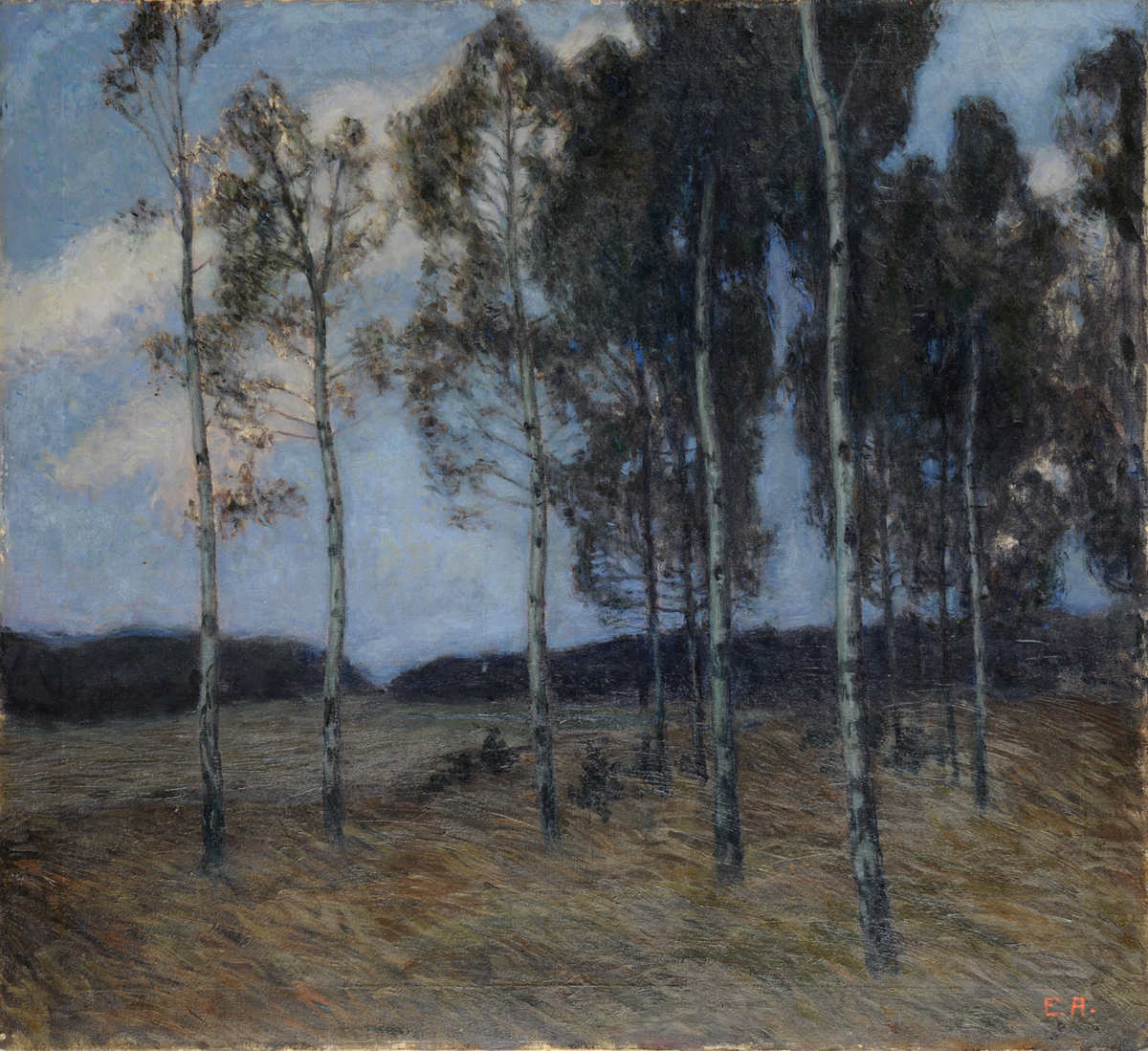 ”Björkhage efter solnedgång” målades av Ester Almqvist. Solen har nyss gått ner och skymningen är i antågande. Det ser kyligt ut, en sådan kväll som kräver en tjockare kofta. Kanske blåser det lite och fukten stiger från marken. Vid horisonten syns siluetten av den kvällsmörka skogen. Gräset runt björkarna är gulnat, kanske är det sensommar, i brytningen mellan ljumma sommarkvällar och råa höstaftnar. De sista gräshopporna spelar innan kylan och natten kommer.