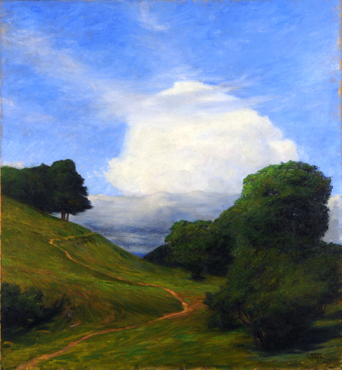 Ett fåtal dominerande former ger detta landskap en kraftfull verkan: den gräsklädda sluttningen, stigen som slingrar sig upp mellan de mörka, enhetliga träden och det vita, runda molnet som dominerar den blå himlen. Himlen genomkorsas även av tunna molnslöjor som stramar upp kompositionen och förstärker molnets dominerande roll i bilden.