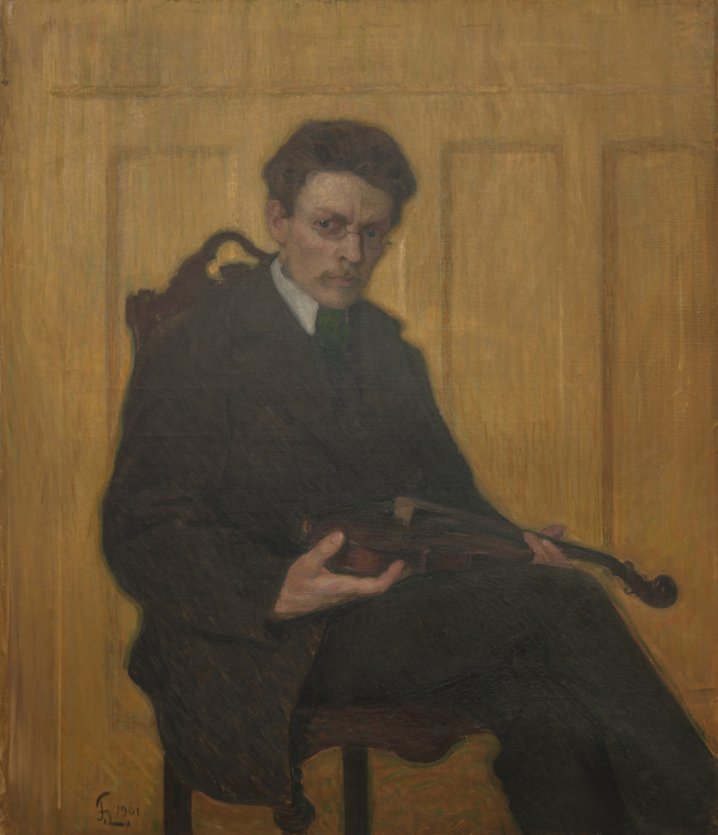 Den smale konstnären med tjockt hår, blickar ut åt vänster genom tunna glasögon. Han håller en fiol i händerna. Den svartklädde mannen avtecknar sig mot den ljusa träpanelens guldskimrande fond. Ahlgrensson ser sammanbiten ut. Det är ett vänporträtt som lyfter fram konstnärskapet som ett allvarligt kall och konsten som en andlig dimension i tillvaron. Just så betraktade nog Rackstadkonstnärerna sitt yrke; genom att uppenbara skönheten omkring oss och naturens andliga dimensioner ger konsten tröst i en hård tillvaro.