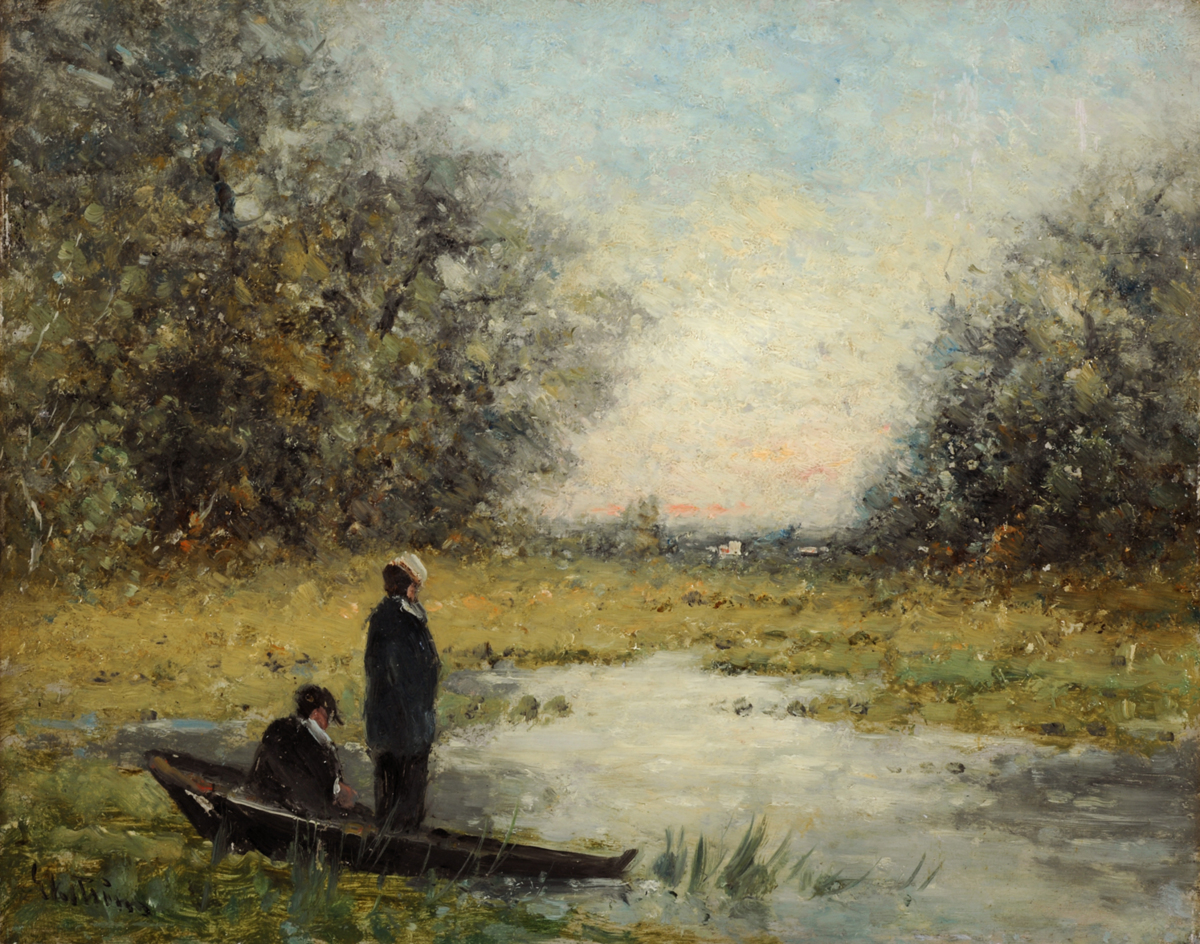 I förgrunden till vänster i bilden ligger en eka uppdragen från ett vattendrag mot en sank, gräsklädd terräng. I ekan sitter en man. Bredvid honom står en annan figur, troligen en kvinna. Båda är sedda snett bakifrån. Kvinnan, som har en ljus huvudbonad, ser ut över flodlandskapet. Mellan två träddungar öppnar sig utsikten mot den disiga horisonten. Ett varmt skymningsljus har gjutits över bilden. Himlen glöder i orange närmast horisonten och tonar ut mot blått. Det blekoranga ljuset reflekteras av flodens vattenspegel. Mannen och kvinnan tycks ha stannat upp för att betrakta solnedgångens hänförande skådespel. Det är en enkel scen med ett stråk av vemod.