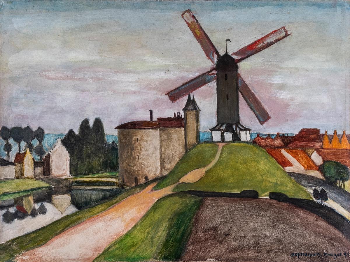 Sager-Nelson inspirerades av den medeltida stadens byggnader och mörka mystik, men denna bild är ljus och klar i färgerna. En väderkvarn på en konstgjord höjd dominerar utsikten. Till höger om den skymtar stadens hustak. Till vänster återfinns en borgliknande byggnad med två smala torn, några mörka träd samt två trappstegsgavlar som speglas i kanalens vatten.