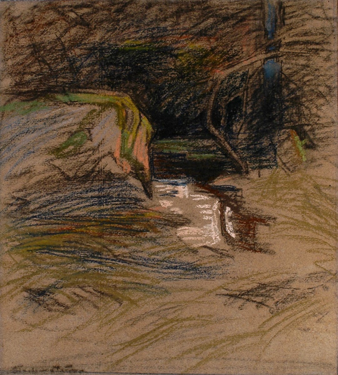Bilden är en skissartad landskapsstudie i stående format där stora delar av det bruna papperet lämnats naket. En klippa avtecknar sig i bildens vänsterkant. Centralt i bilden reflekteras vattnet i en bäck som rinner ut i den sjö som anas i den mörklagda bakgrunden. I högra delen av bilden syns en krökt trädstam.