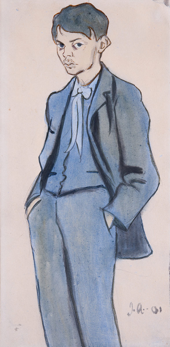 Självporträtt Ivar Arosenius. IA står med händerna i byxfickorna och tittar mot betraktaren. Man ser inte hans fötter/skor. Han är klädd i en blågrå kostym och runt halsen har han en kravatt, en rosett med långa band, knuten.
