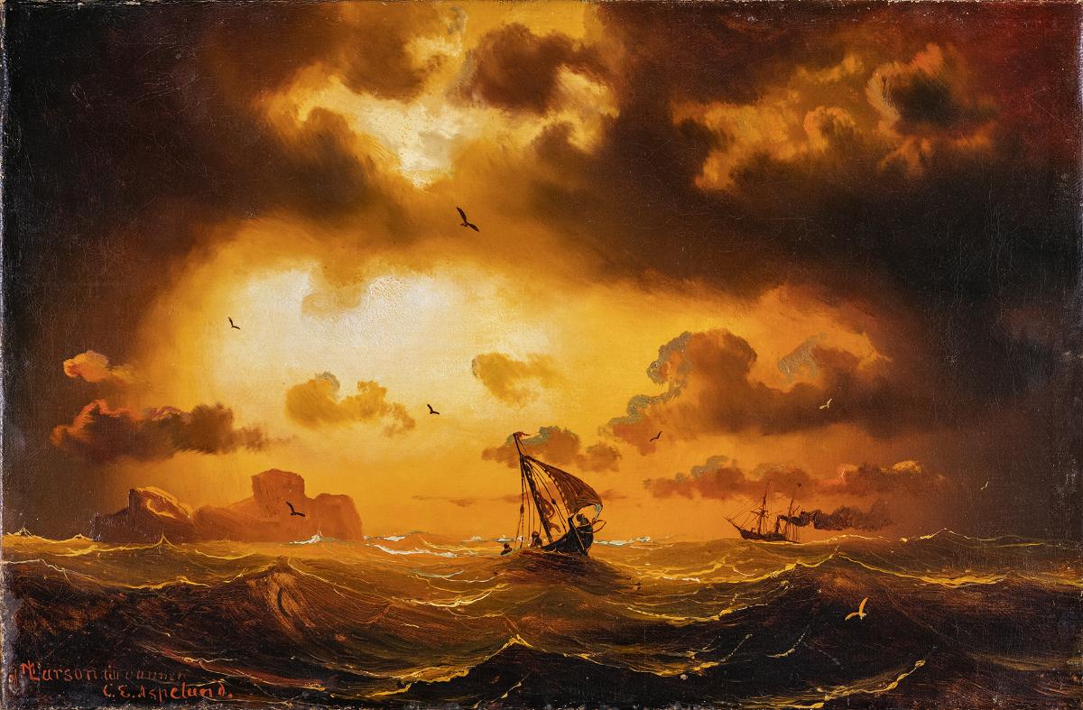 Signatur: Af MLarson. (monogram) till vännen C.E. Aspelund.