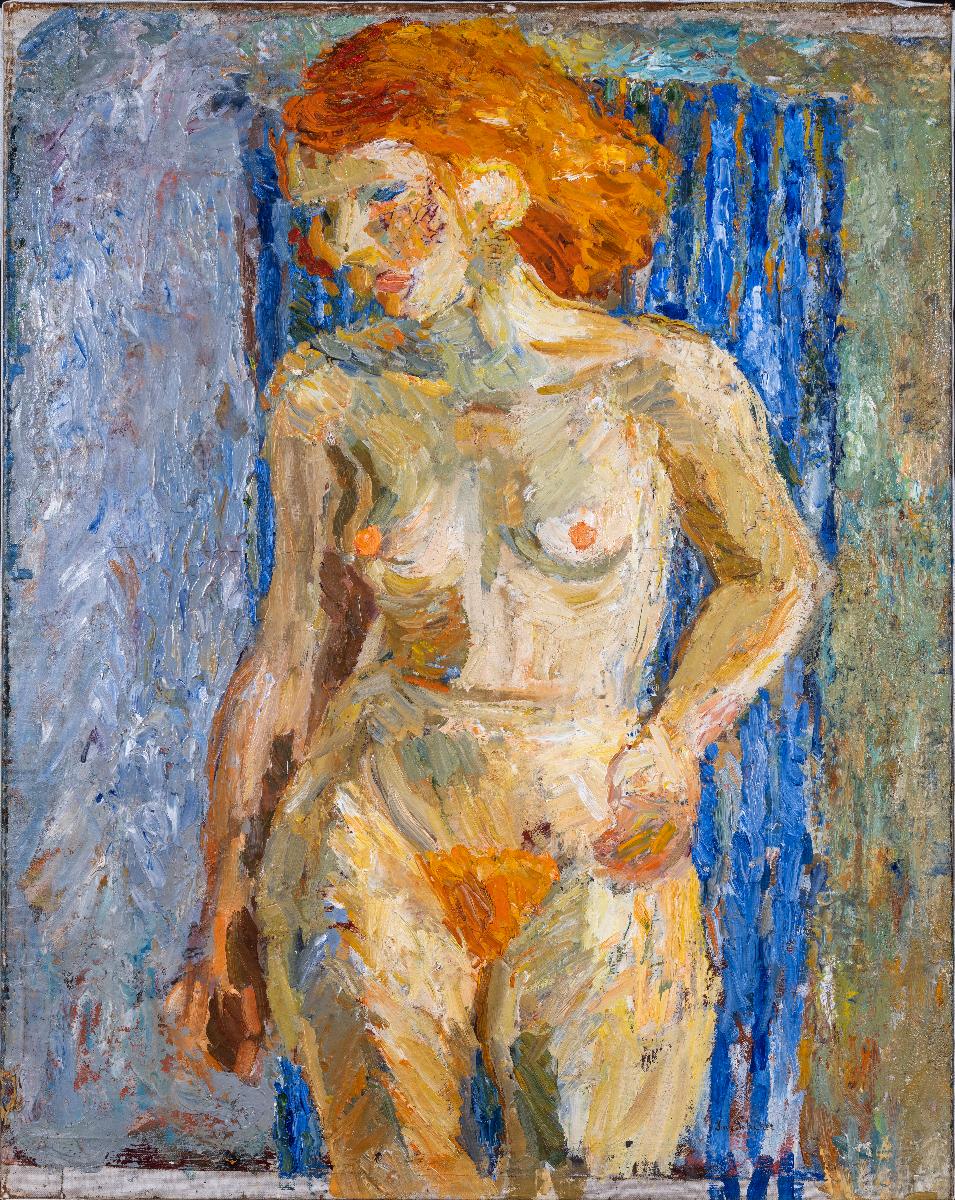 Den kvinnliga nakenmodellen är frontalt avbildad med huvudet vinklat nedåt och något åt vänster. Högerarmen hänger avslappnat rakt ner medan hennes vänstra arm är vinklad och handen vilar på höften. Modellen har intensivt rödorange hår. Kroppen, som är belyst från höger, avtecknar sig mot ett djupblått draperi. Runt detta finns till vänster en grå yta, till höger en grön. Målningen är utförd i ett flödigt föredrag med synliga penseldrag som mjukar upp formerna. Måleriet ger intryck av starka sinnesförnimmelser, ljuset som reflekteras av huden, av svalka och hetta. Teckningen är mera summarisk, grov och knappast korrekt. Händerna ter sig deformerade. Ögonen är knallblå.