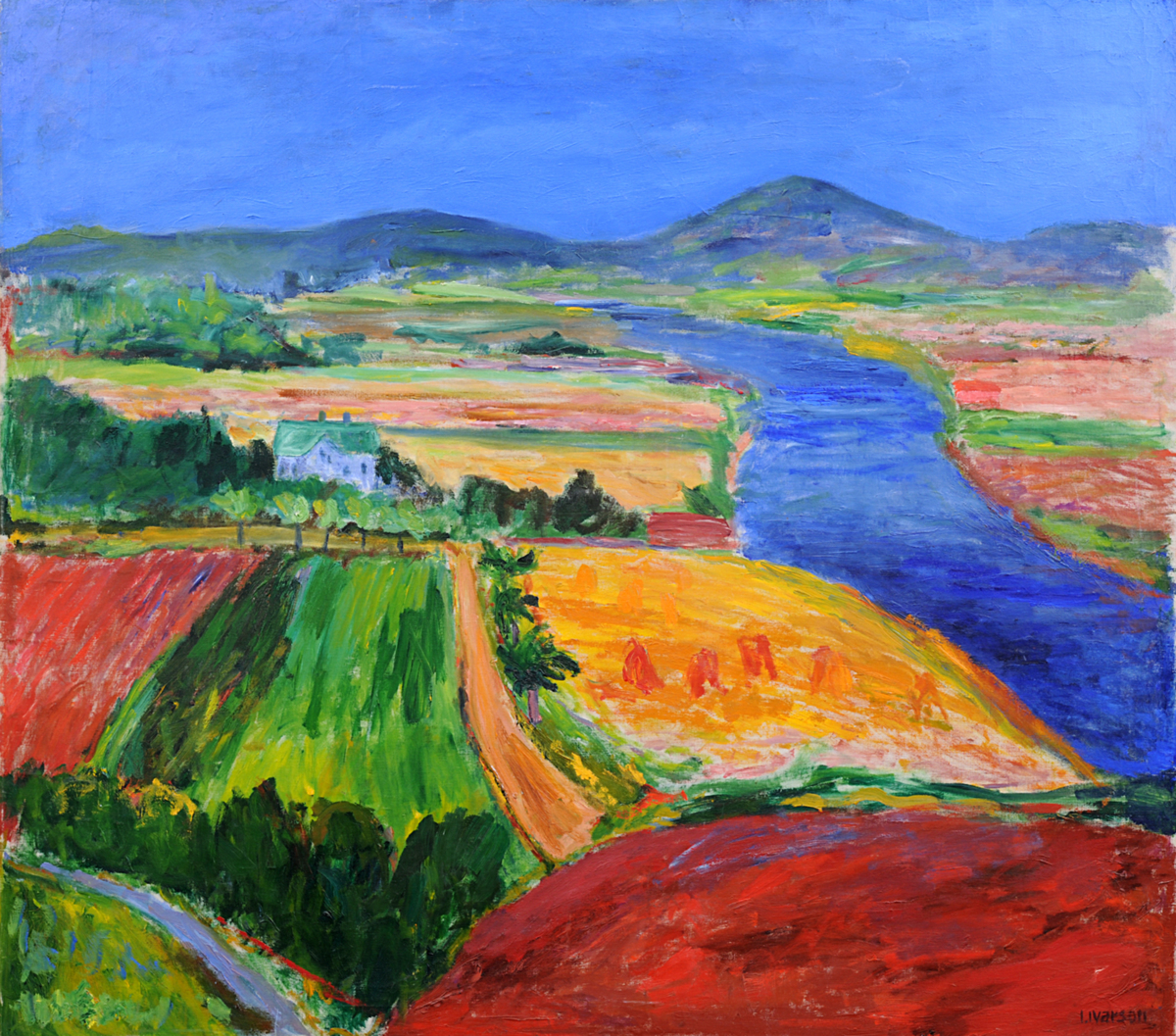 Denna målning är tillkommen senare på 1930-talet, då Ivarson levde separerad från sin familj i Göteborg. Målningen har närmare daterats till början av denna period, 1932–1935. Han ger sig nu i kast med motivet på en stor kvadratisk duk. Landskapet med älven ses från en röd höjd i förgrunden. Nedanför sträcker sig älven i en rytmiskt krökande båge, målad i intensiv blå färg. Vägar och åkerfält har målats i rött, grönt och gult. Ett ljusblått hus med grönt tack finns i mellangrunden, något till vänster. Vid horisonten avtecknar sig blånande berg mot en koboltblå himmel.