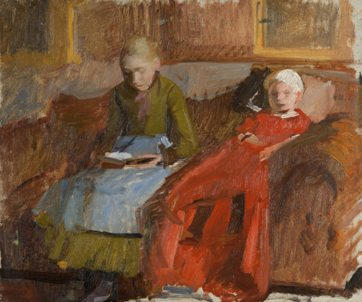 Kvinnan i soffan sitter allvarlig och koncentrerad och läser ur en bok. Flickan bredvid har på flickors vis glidit ner i en halvliggande ställning medan hon lyssnar till moderns berättelse. Tittar vi noga ser vi att hon blivit insvept i en röd pläd och fått en kudde under huvudet. Kanske är det en liten konvalescent vi ser, som blek och trött fått lämna sjuksängen för en stunds högläsning i soffan. Konvalescenter och sjuklingar var för övrigt omtyckta motiv under slutet av 1800-talet. Målningen är en av många oljeskisser av Anna Ancher som finns bevarade. Med kraftiga och hastiga penseldrag har hon strukit upp bilden i djärva färger. Moderns ljusblå förkläde bryter av mot den gulgröna klänningen och bildens i övrigt varmt gula, bruna och röda färgfält. Men framför allt är det ljuset som intresserat konstnären. Från ett osynligt fönster faller det in på gestalterna i soffan, förstärker flickans blekhet, belyser den uppslagna bokens blad.