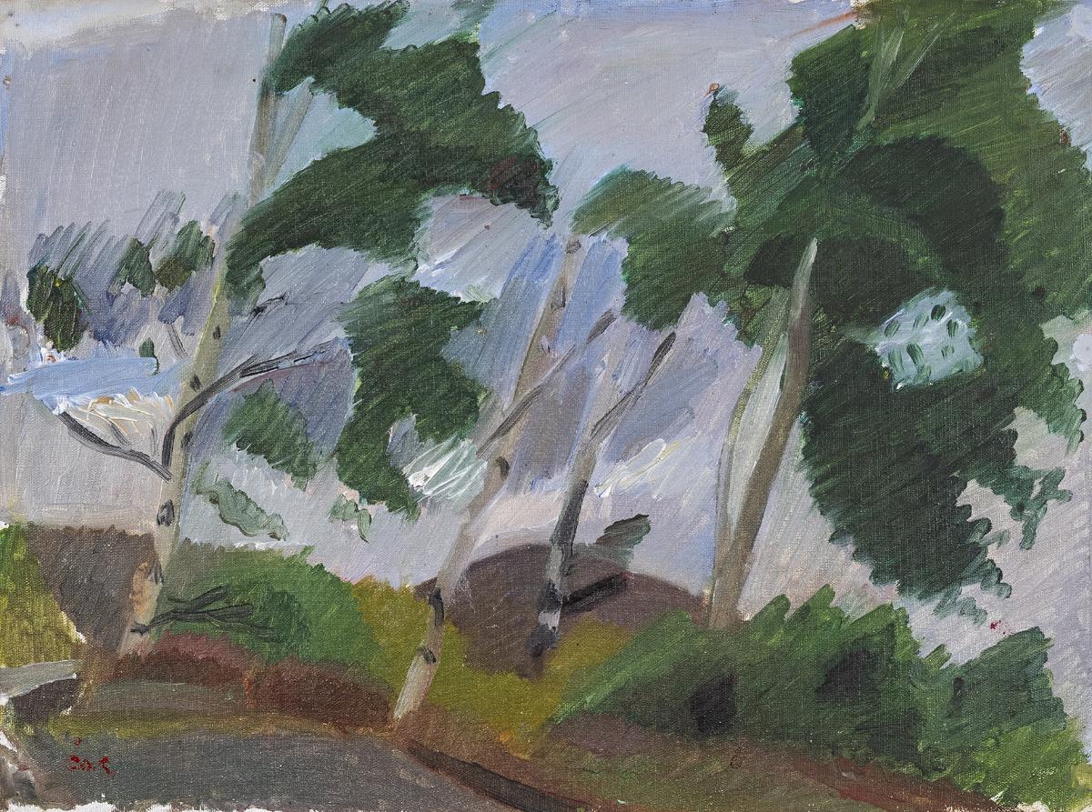 Landskapsstudien ger en levande ögonblicksbild av björkarnas rörelser i blåsten uppe på höjden, av ljus och väderlek, samtidigt som formerna också rytmiskt grupperas på bildytan i en komposition med abstrakta kvaliteter. Sin vana trogen går Göransson analytiskt tillväga för att studera motivet, återge färgerna och stämma dem mot varandra i nyanserade plan. I de vispande penseldrag som bryter upp ytornas enhetlighet kan man höra ett eko från Paul Cézanne och Karl Isakson, två av Göranssons viktigaste konstnärliga förebilder.