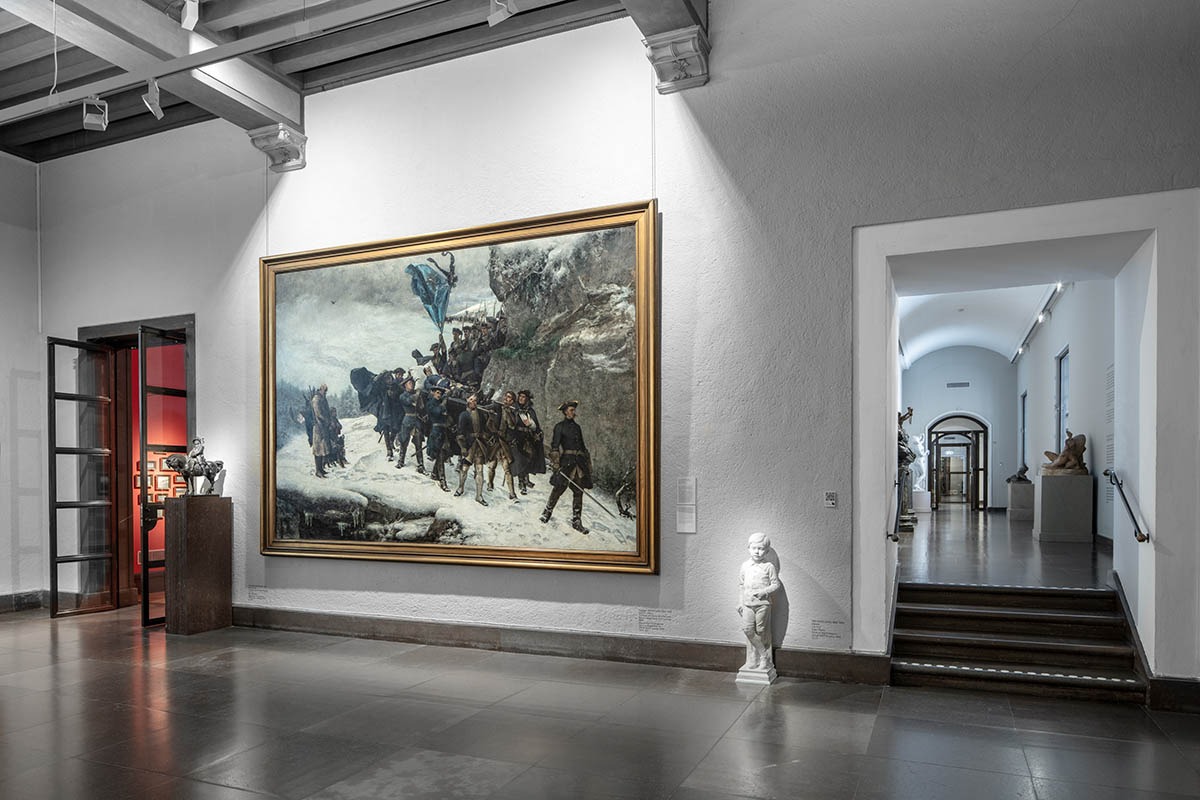 I Karl XII-hallen visas akademisk konst från 1800-talet. Med akademisk konst avses främst ett berättande måleri som skildrar historiskt viktiga händelser, bibliska motiv, fornnordiska eller antika myter. Gustaf Cederströms Karl XII:s likfärd hör till de främsta exemplen på svenskt historiemåleri under 1800-talet. Skildringen är knappast realistisk, Karl XII bars inte hem på bår. Men det är ett mäktigt verk som skildrar slutet för den svenska stormaktstiden på ett romantiskt glorifierande sätt. Mot slutet av århundradet förekom även mer socialt engagerande motiv, som Cederströms stora målning Frälsningsarmén. Miss Booth besöker en krog i Paris 1886 eller Nils Forsbergs Akrobatfamilj inför cirkusdirektören 1878.